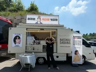 The accompanying photo shows Park Shin Hye showing off her cute heart-shaped smile in front of the coffee car that Um Jee Won brought to the set.