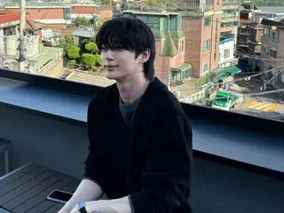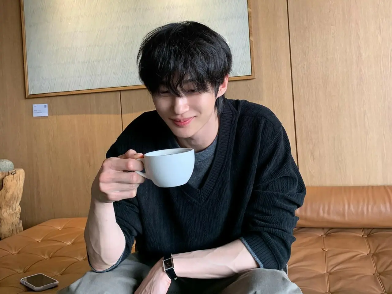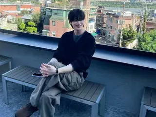 The released photos show Byeon WooSeok wearing a black sweater and beige pants, relaxing in a rest area in the city.