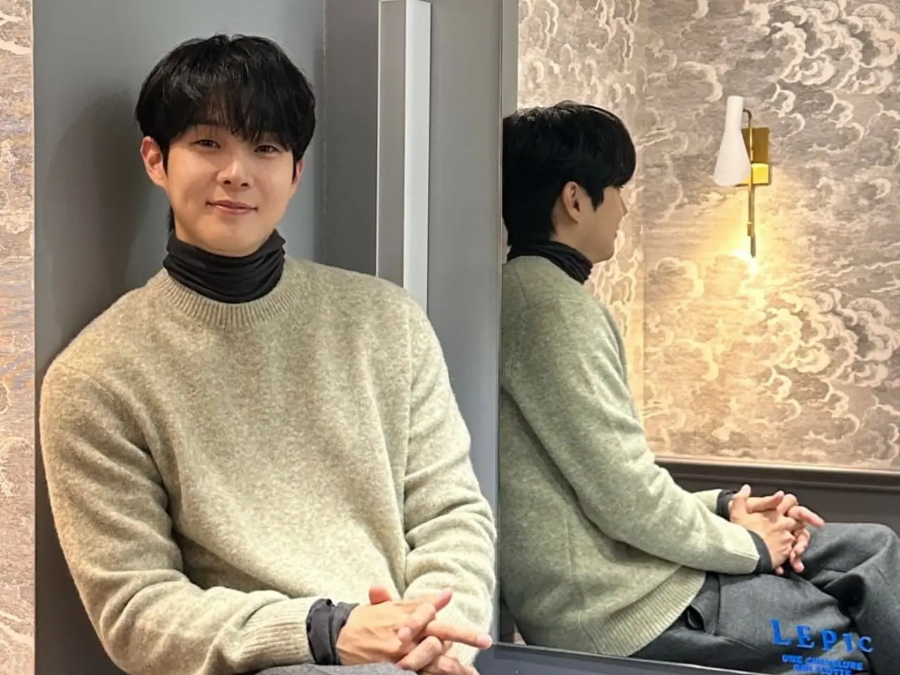 Choi Woo-shik is wearing a grey turtleneck layered with a light khaki or beige knit and dark grey wide pants, creating a comfortable yet sophisticated look.