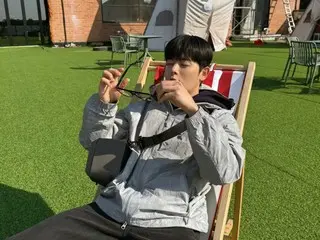 In the published photos, Kim Dongjun is sitting on a sunbed on the green grass, touching his sunglasses and enjoying a relaxing afternoon.