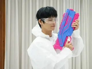 The photos show Seo In Gook holding a cookie. He also poses for the camera, wearing goggles and holding a water gun, looking like a young boy.