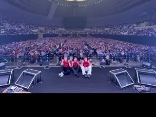 The photos show CNBLUE posing for the camera in their stage costumes. They also released commemorative photos taken with fans who flocked to the venue.