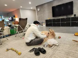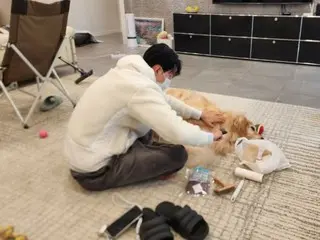 I added some text and posted some photos. The photo that was released showed Jung Shin brushing his dog Simba's fur. Jung Shin, wearing a mask, has a familiar hand.