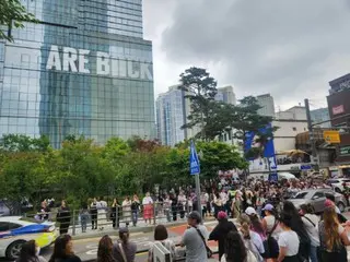 ”Congratulating RM and V on their discharge”... 1,500 BTS fans flock to HYBE building