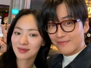 In the photo, Nam Goong Min is seen with his head pressed against Jeon Yeo Bin, the heroine of the SBS Fri-Sat drama "Our Movie," showing off his puffed-out cheeks.