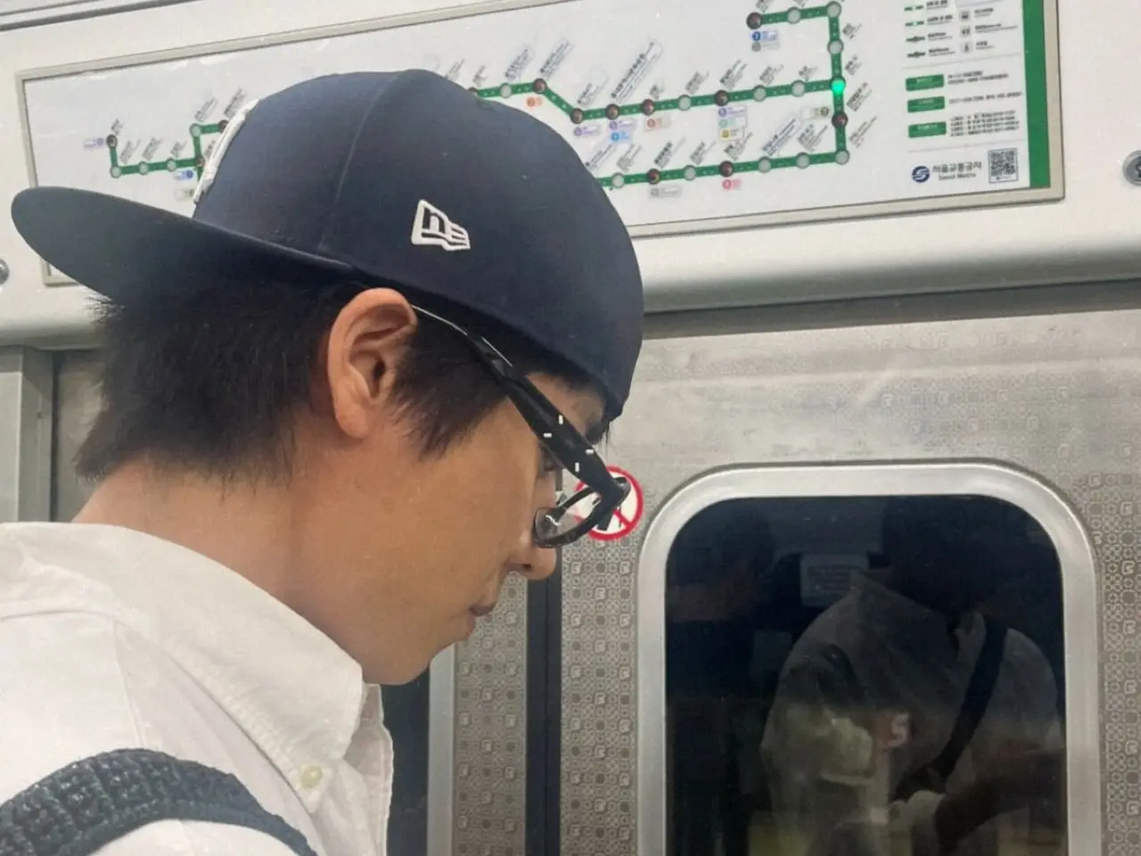 The photo shows Choi Jeong Hyub looking at his smartphone on the subway.
