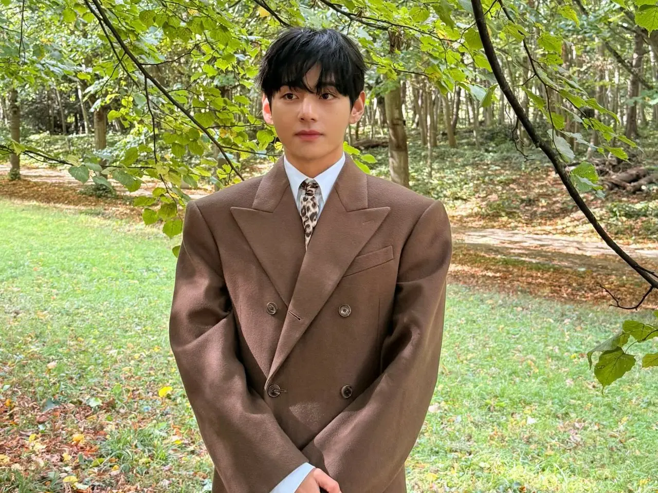 The photo captured V wearing a long brown jacket, a light blue shirt, and a gorgeous tie.