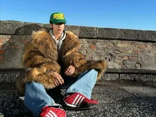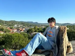 Yunho (U-KNOW) is drawing attention with his bold pose, sitting heavily on the stone pavement under the clear blue sky.