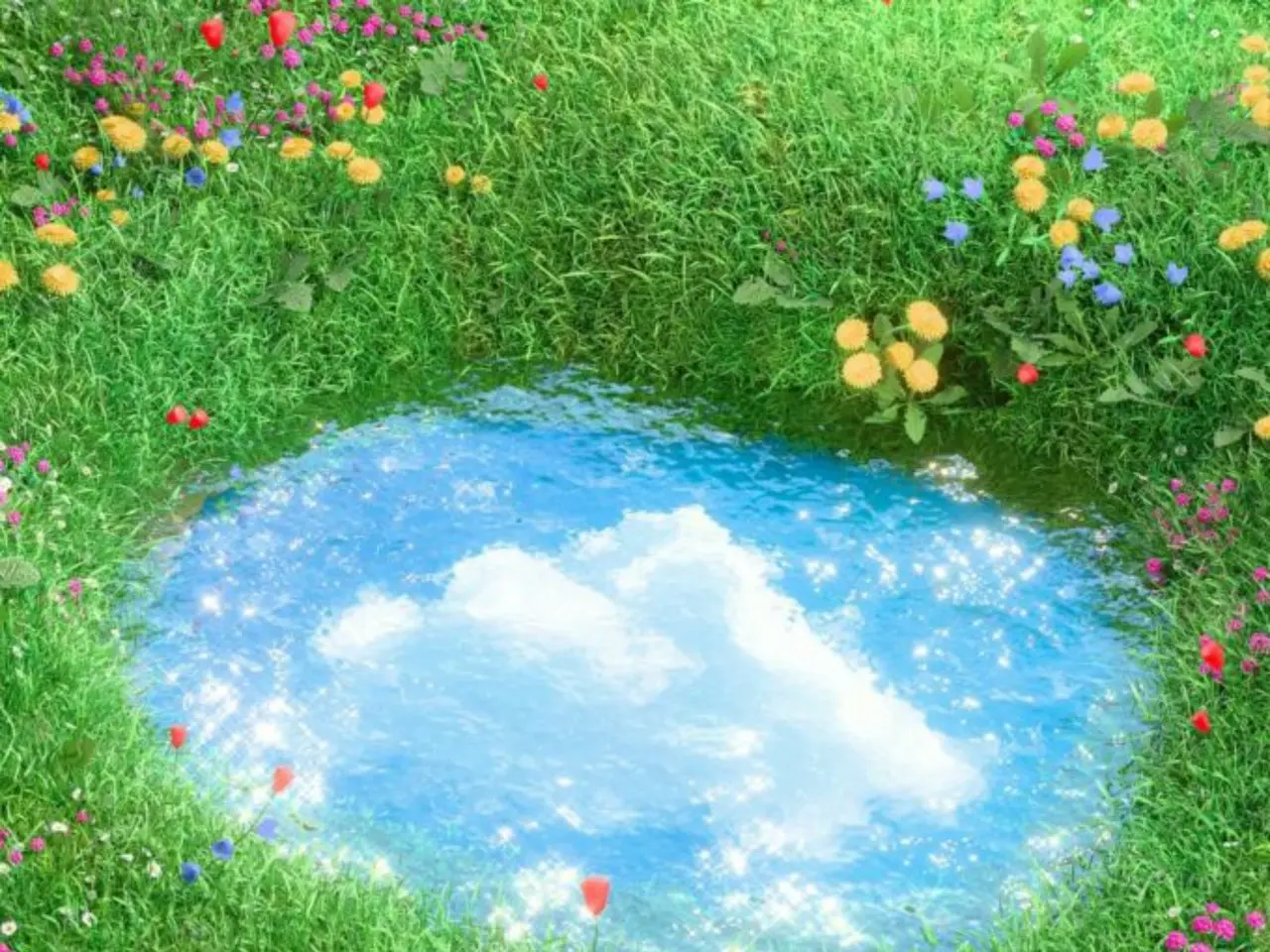 The photo shows what appears to be a small spring in the middle of a grassland.