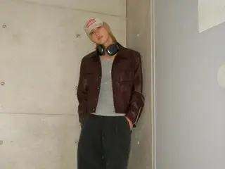TAEMIN is wearing a burgundy leather jacket and a gray T-shirt.