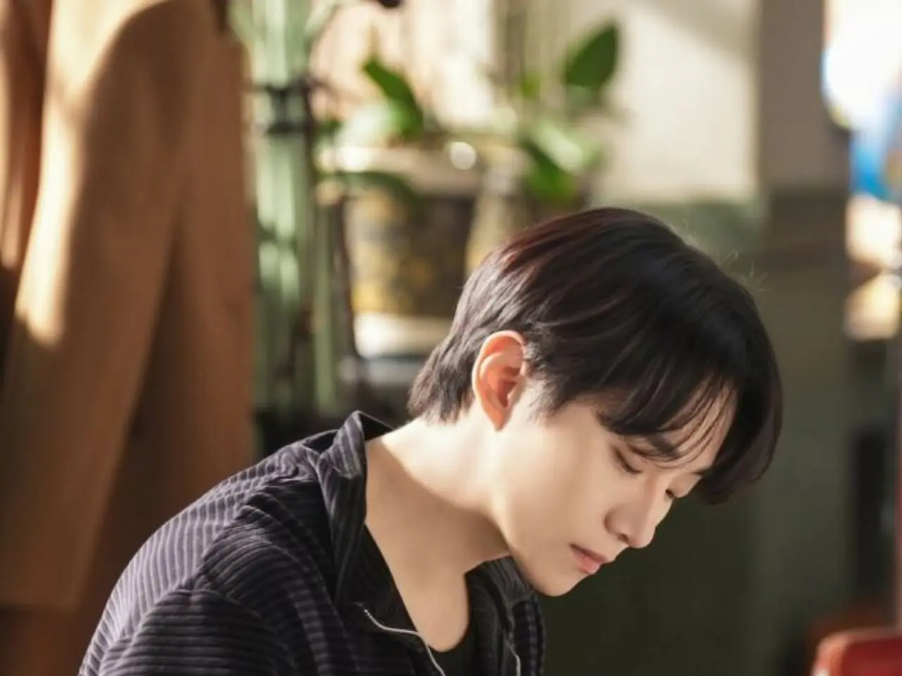 Junho is portraying the character Kang Tae-poong in a dark outfit.
