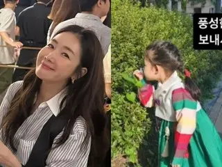 '' along with two photos. In the photo, Choi Ji Woo's daughter wore a green hanbok and showed off her cute visuals.