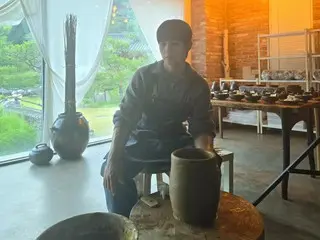 In the published photos, Jung HaeIn is seen striking various poses while making pottery. In particular, he shows off his muscular arms to baby Fei Soo, inviting a gap moe.