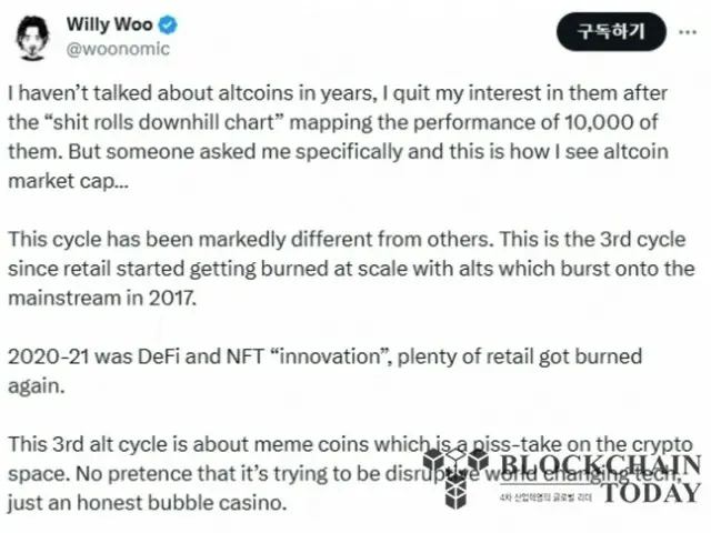 On the 26th, Woo expressed his opinion on X (formerly Twitter) that "Since the 2017 altcoin bubble, the altcoin season will be weaker with each cycle."