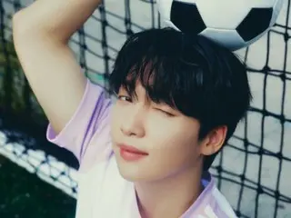 A concept photo has been released. In the released concept photo, JEONG SEWOON slipped out of the classroom, put a soccer ball on his head on the playground, and winked with a refreshing charm.