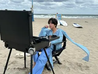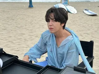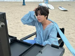 In the photo, Jang Keun Suk is wearing a refreshing light blue long shirt with a tie on the sandy beach, and is checking out the photo with a serious expression.