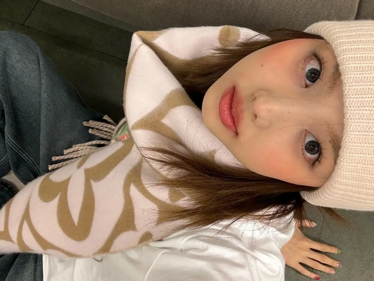 I posted a few photos with the tag. In the published photo, NAYEON, who has pink cheeks and cute peach makeup, is seen wearing a Louis Vuitton knit hat and scarf.
