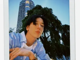 In the photo, Yong Hwa is seen looking at the camera with the Tokyo Midtown in the background. Yong Hwa is wearing a blue shirt with a white inner layer.
