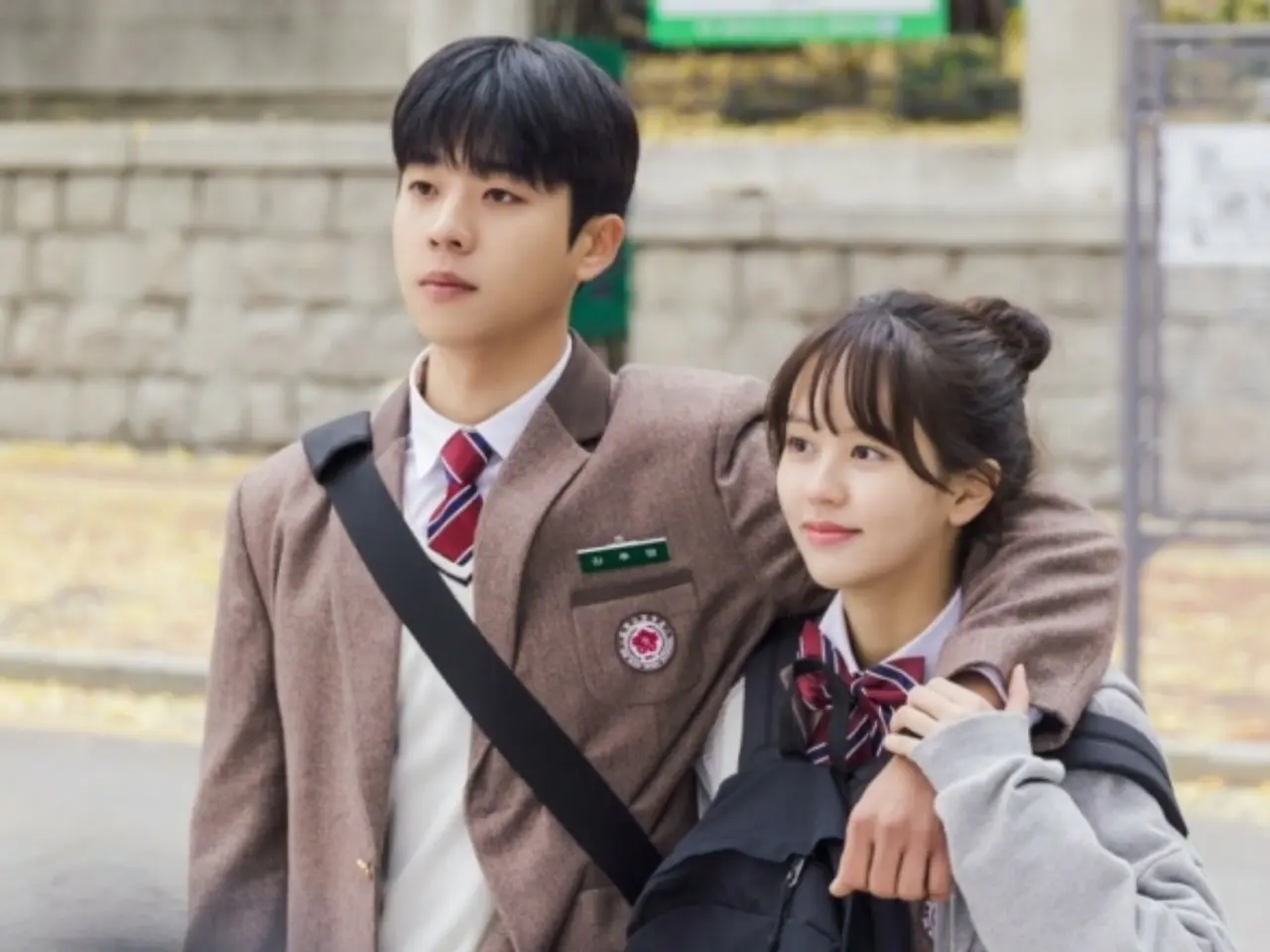 This is their first meeting in front of the school gates of Hong Joo Hyeop. Hong Joo has Hoo Young's arm around her shoulder and is smiling as if it's nothing special. Hoo Young, on the other hand, has a serious look on his face.