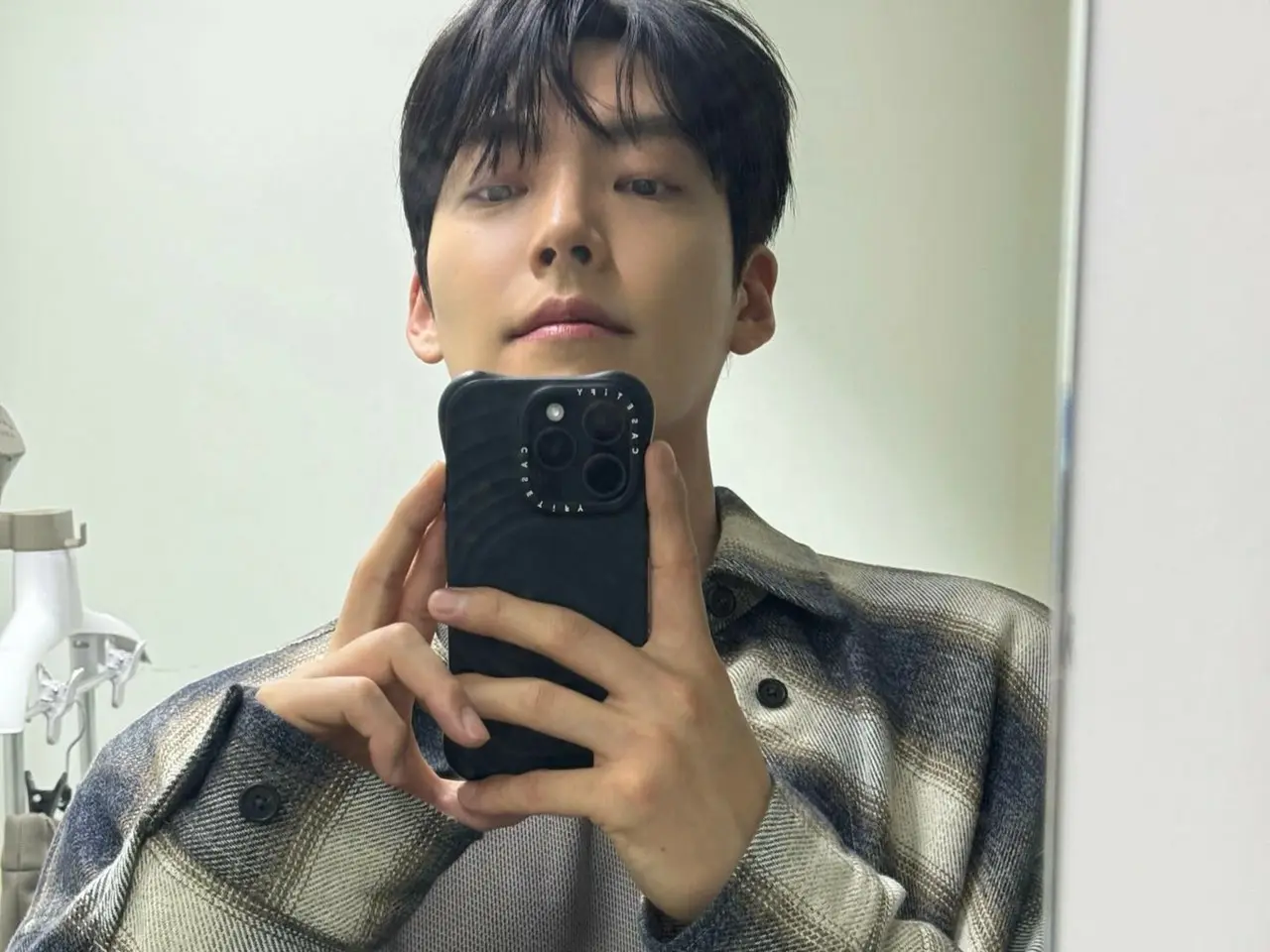 In the released photo, Kim WooBin is seen taking a mirror selfie with his smartphone.