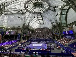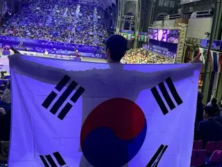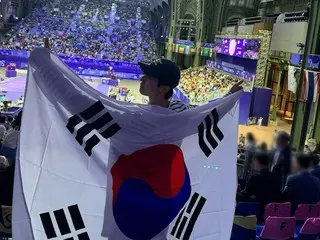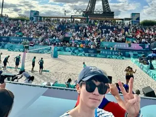 He was seen standing in the audience with a large Taegeukgi flag draped over his back. He also took a selfie at the beach volleyball stadium with the Eiffel Tower in the background.