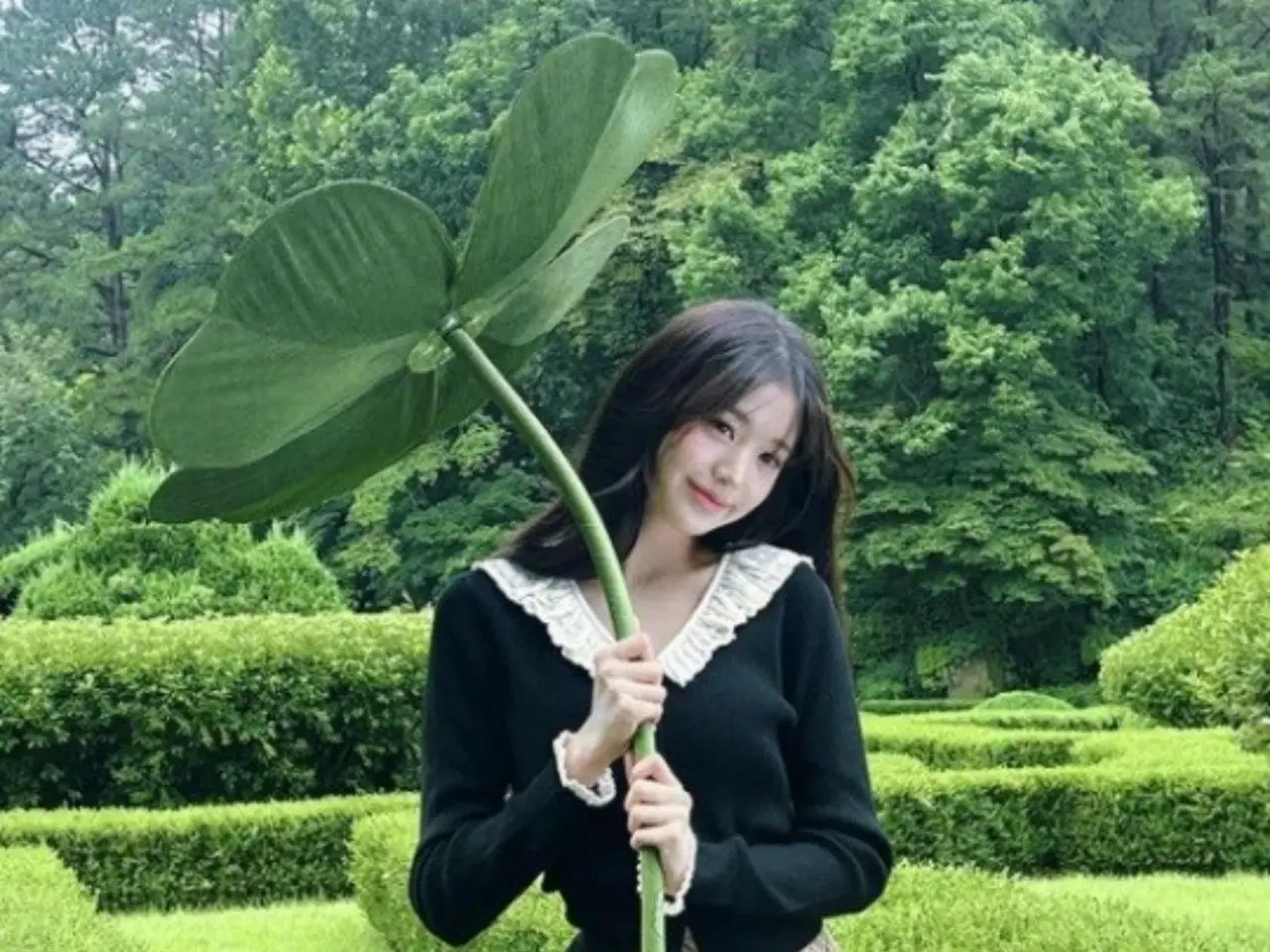 In the photo, Jang Won Young is posing with a large four-leaf clover.
