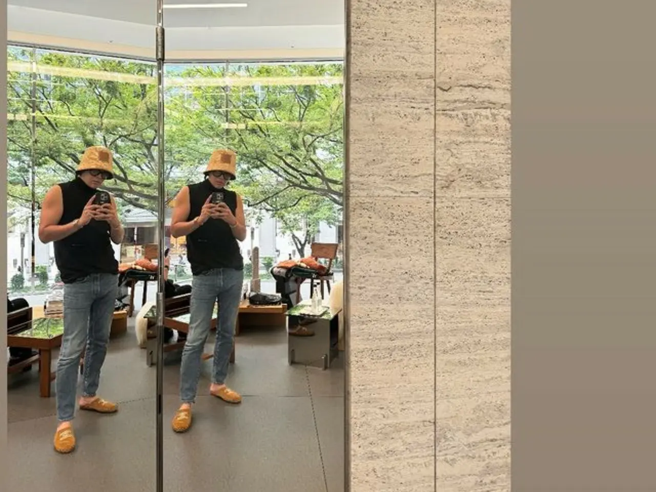 In the photo, Jang Keun Suk is wearing a bucket hat and a black sleeveless top and taking a mirror selfie.