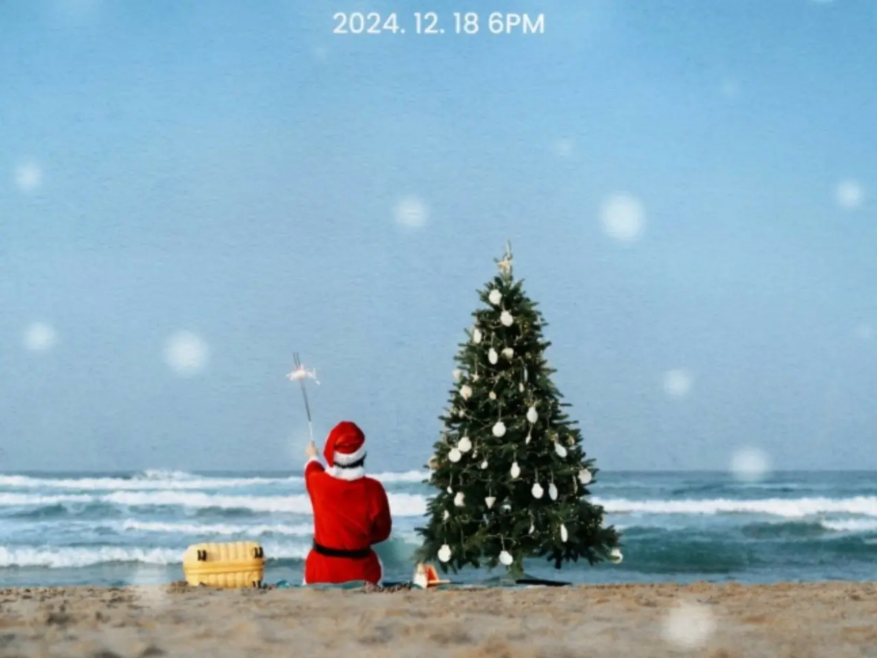 The image shows a Christmas tree in the middle of a beach, with a person wearing a Santa suit next to it.