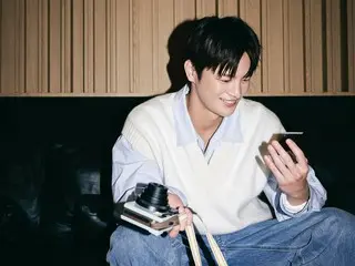 He is wearing a shirt, a knitted sweater, and jeans, and holding a Polaroid camera in one hand.