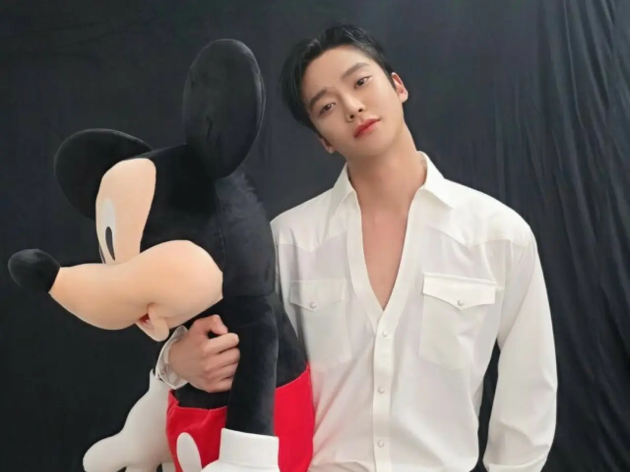 The mismatched stuffed toy adds a touch of warmth to Ro Woon's sexy all-white look.