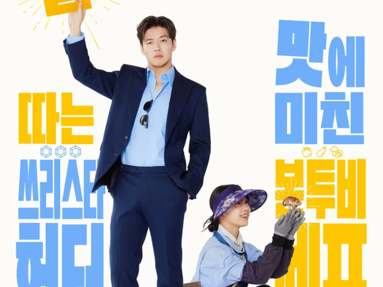 Bomu-woo is dressed in a suit and shows his determination to get three stars, while YOUNG JI-yu is dressed modestly in an apron and sun visor, gazing lovingly at the mushrooms.
