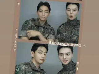 On the 9th, V posted four consecutive photos on his Instagram Stories. The photos showed him in military uniforms and a four-part photo with actor Song Kang.