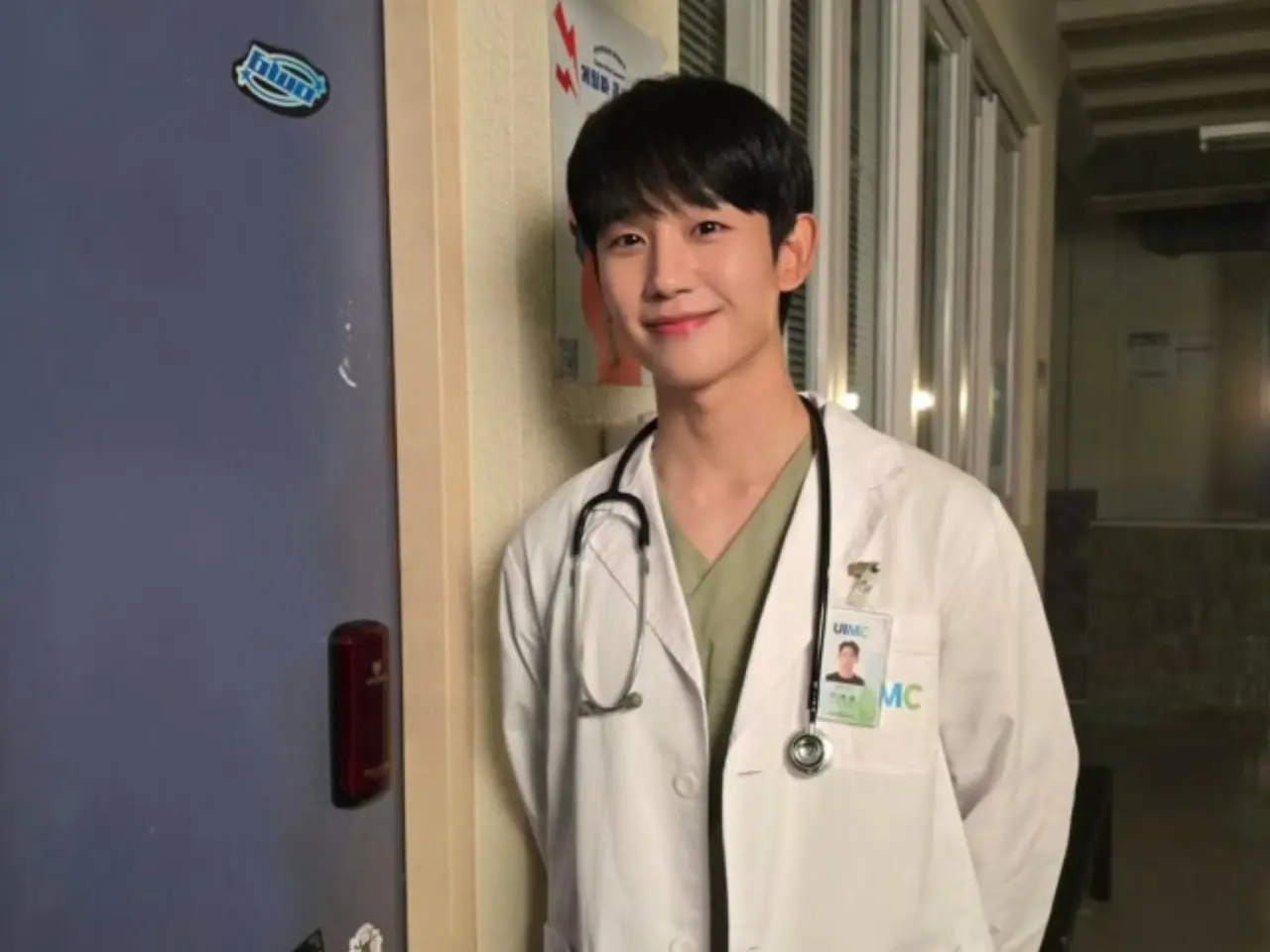The photo shows Jung HaeIn wearing a doctor's coat and smiling with a stethoscope around his neck.