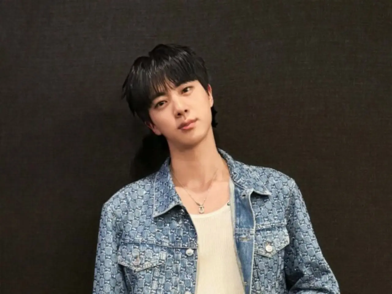 The photo shows JIN wearing a blue suit and looking at the camera with one hand in his pocket.