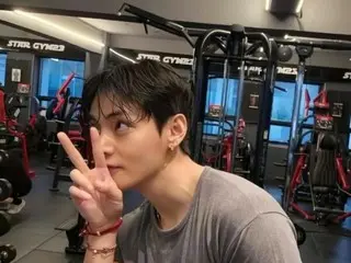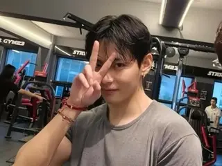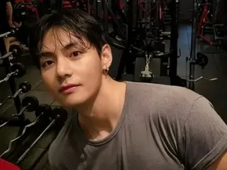 V is making a peace sign with his hair wet with sweat. His muscular arms and chest catch the eye, while his fresh, bare-faced appearance is also captivating.