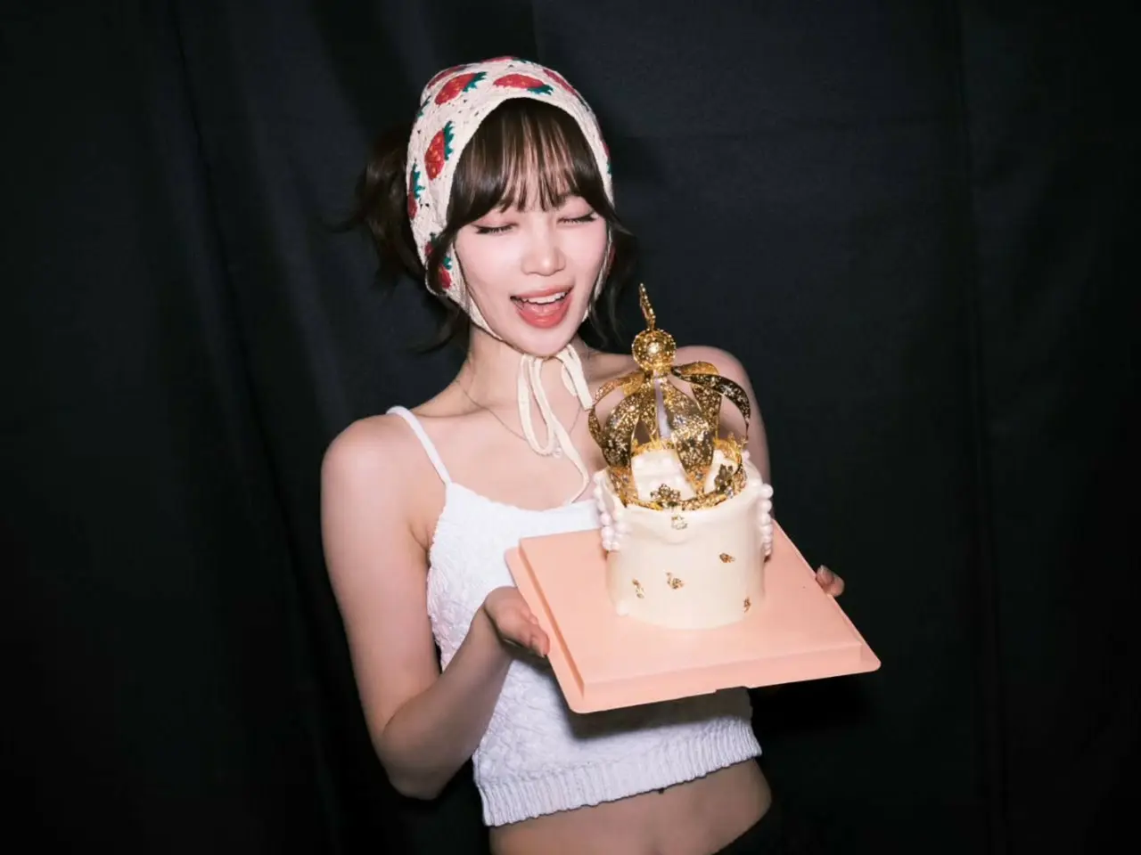 In the published photo, Kim Chae Won is wearing a strawberry knitted hat, a white sleeveless crop top, and a crown-shaped birthday gift.