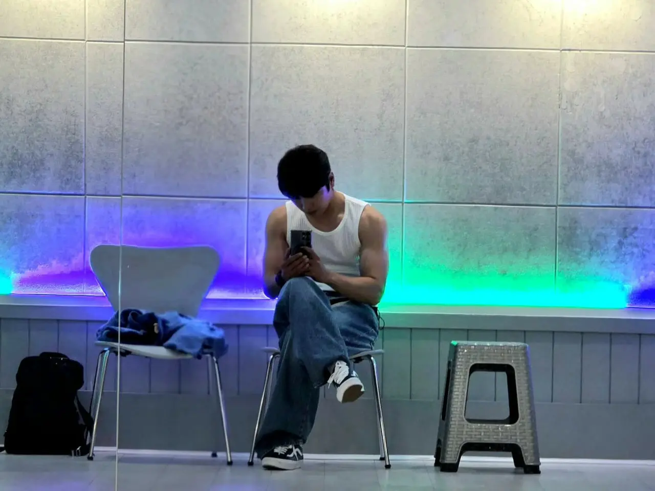 She appears to be preparing for the stage at the "Lee Yi Kyung SHOW" to be held in Tokyo in September. She is sitting on a chair wearing a white tank top and wide denim pants.