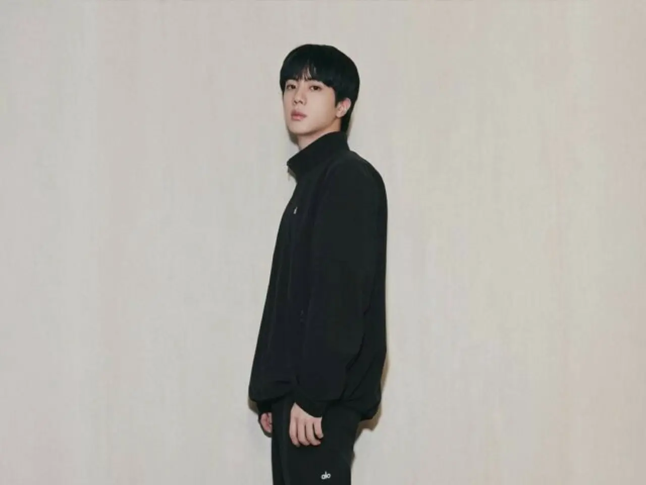 The photo shows JIN wearing black, gray, and brown sportswear.