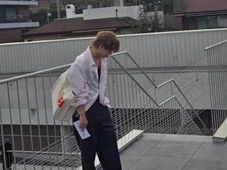 In the photo, Yim Siwan is wearing a pink shirt and leaning on the railing of a rooftop, staring off into the distance.