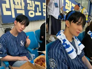 In the published photo, Bae Jin Young is wearing a Samsung uniform and a cheering towel around his neck.
