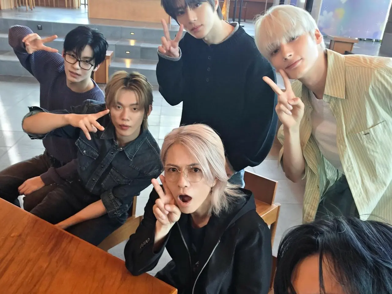 The released photo shows HYDE in the center, with SOOBIN, Yeonjun, BEOMGYU, Tae Hyeong, and HUENING KAI all happily making peace signs around him.