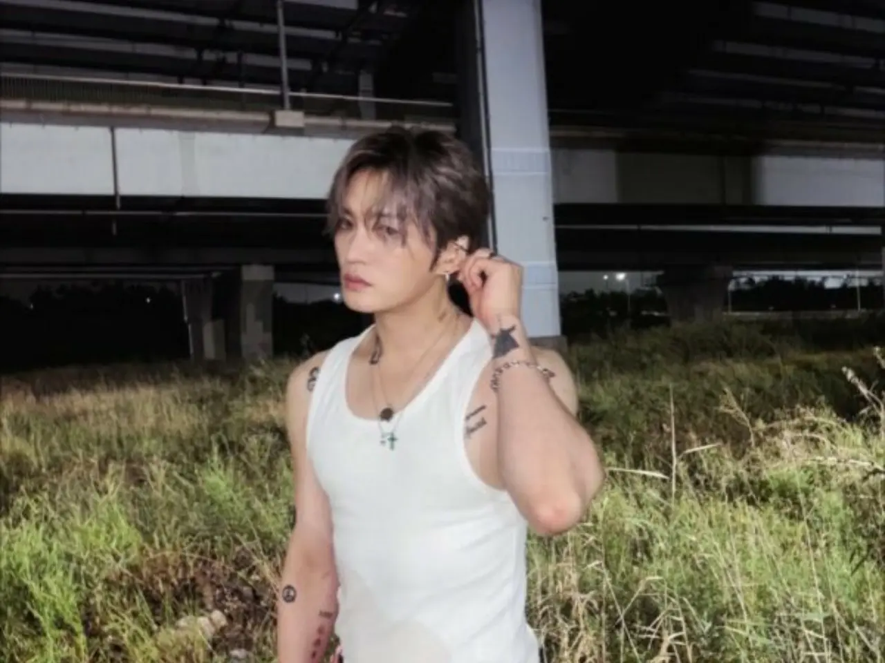 The photo shows Jaejung wearing only a white tank top. Jaejung has caught everyone's attention by showing off his hairstyle and makeup, and sitting on a bed.